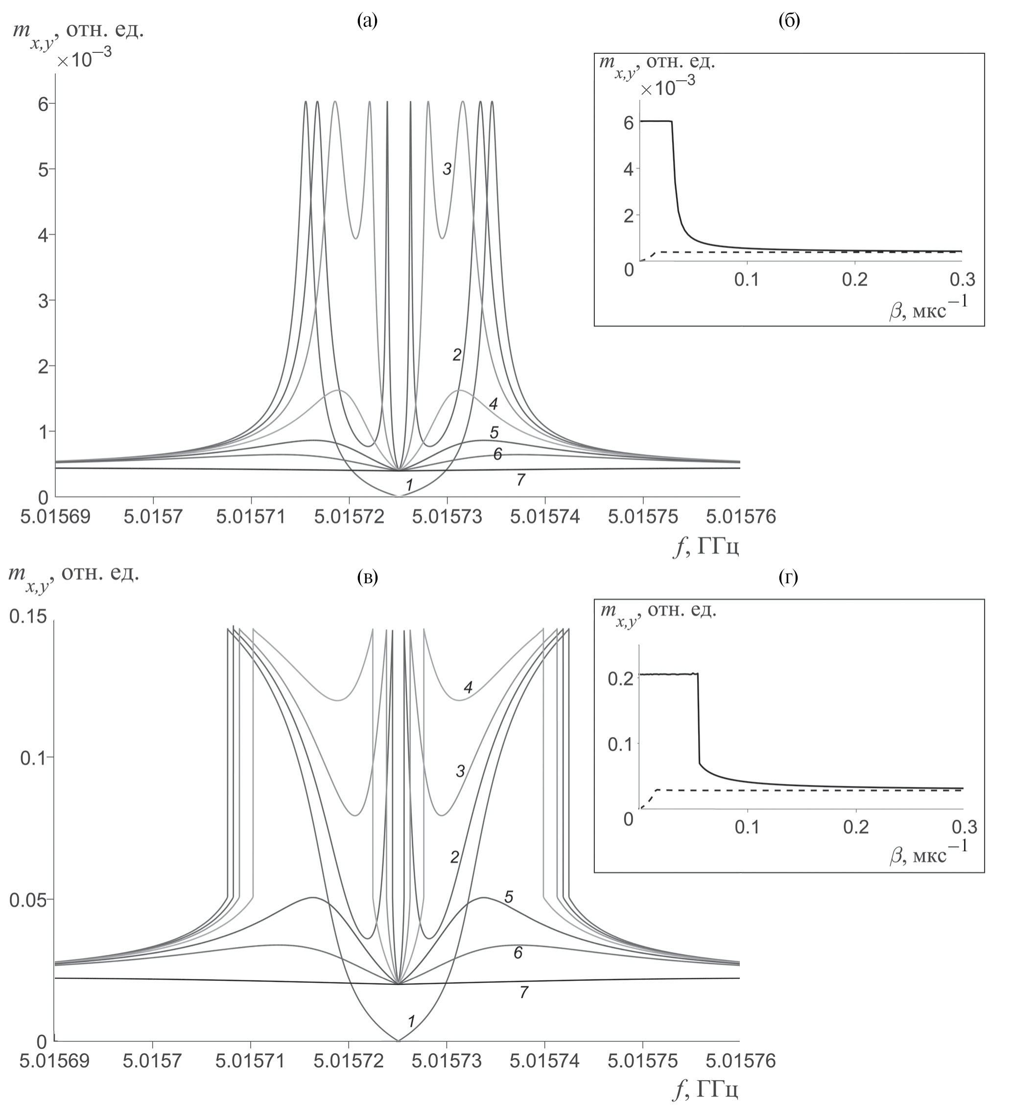 Рис. 6. Формы АЧХ упруго связанной резонансной линии справа от максимума ФМР при β = 0 (1), 0.027 (2), 0.039 (3), 0.055 (4), 0.077 (5), 0.108 (6) и 0.3 мкс–1 (7); на вставках — зависимость максимального (сплошная линия) и минимального (пунктирная) значений амплитуды mx,y от β в линейном режиме (h0 = 0.01 Э) (а, б) и нелинейном (h0 = 0.5 Э) (в, г).