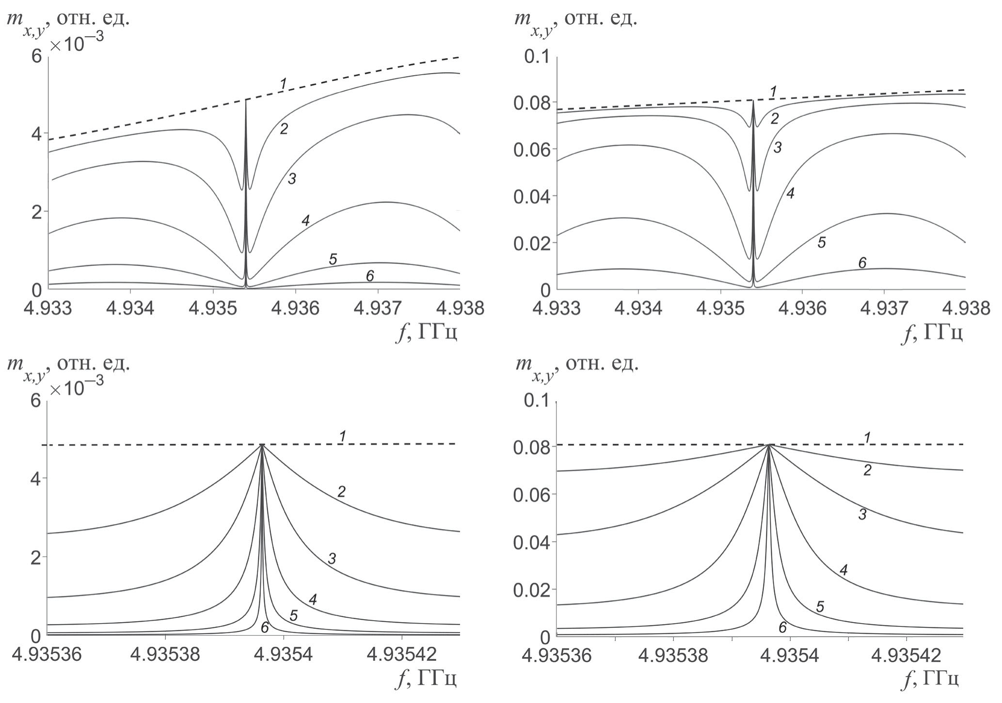 На рис. 5 представлены формы проекций намагниченности на ось Ox справа от максимума ФМР, где упруго связанные резонансные линии намагниченности направлены вверх. Слева от максимума ФМР эти линии направлены вниз (рис. 4), в виде антирезонанса. Предположительно это связано с тем, что в уравнениях (4)–(6) параметр P для упрощения системы подставляется в виде модуля его комплексного выражения. Вблизи максимума ФМР линии имеют дополнительное небольшое расщепление в максимуме (рис. 5а), а в нелинейном режиме упруго связанный резонанс имеет резкий, пороговый характер (рис. 5б).