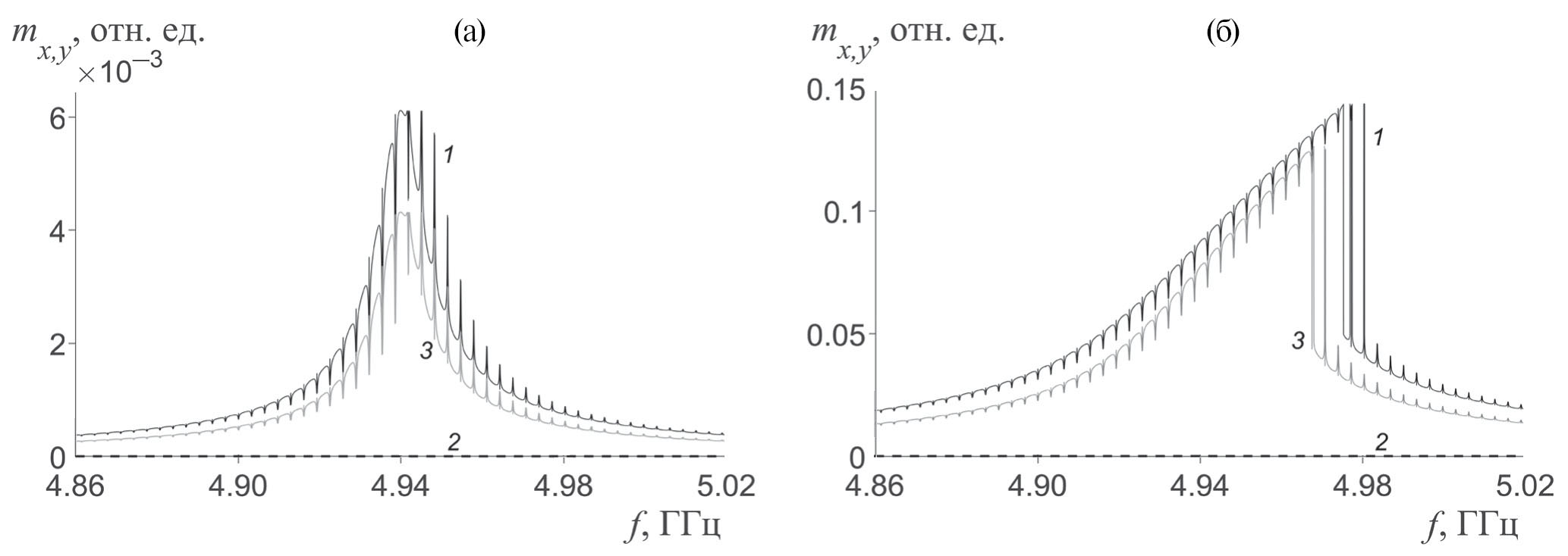 Рис. 9. Вид АЧХ при правой (кривая 1), левой (2) и линейной поляризациях (3): (а) — линейный режим при h0 = 0.01 Э, (б) — нелинейный режим при h0 = 0.5 Э.