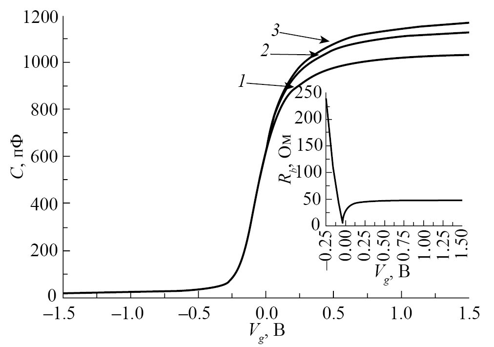 Рис. 1. Высокочастотные вольт-фарадные характеристики и сопротивление кремниевой подложки: емкостные кривые 1 — 1 МГц, 2 — 0.5 МГц, 3 — . На вставке — зависимость сопротивления подложки от полевого напряжения, вычисленная по формуле (13).
