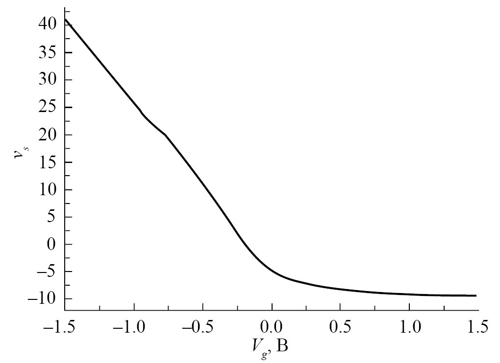 Сформулируем окончательные результаты применения развитого алгоритма: область полевых напряжений, где ВФХ наиболее близка к идеальной, равна ; пФ, пФ, Ωmin = 1.085 × 1018Ф–2В–2. Расхождение значений и Cиз* составляет всего 7 %, а меньше в 1.6 раза. Таким образом, концентрация доноров непосредственно у ГР Si–SiO2 в 2.56 раза меньше, чем в объеме кремниевой подложки, что подтверждает тезис [5], высказанный во Введении, о роли процессов диффузии легирующей примеси при высокотемпературном окислении. Графики νs(Vg) и psq(Vg) показаны на рис. 2 и 3.
