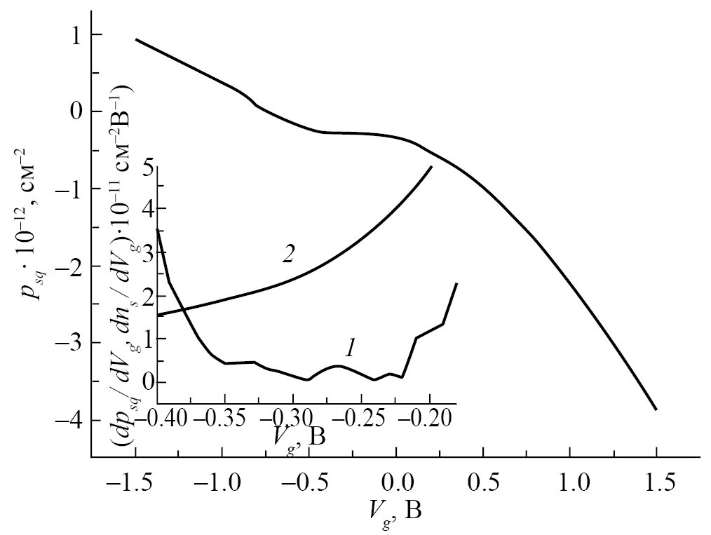 Рис. 3. Зависимость суммарной концентрации встроенного заряда, зарядов электронных ловушек и неосновных носителей заряда на контакте Si−SiО2 от полевого напряжения. На вставке — окно Vg, где характеристика наиболее близка к идеальной; кривая 1 — производная от psq по напряжению, кривая 2 — производная от ns по напряжению.