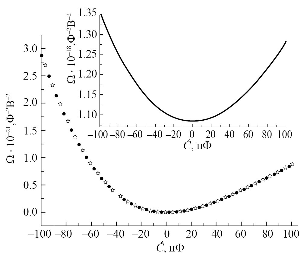 Рис. 4. Зависимость функционала Ω от Cиз и вблизи точки минимума: (сплошная линия), (точки), (звездочки). Переменная является отклонением емкостей Cиз и от значений в минимуме функционала Ω.