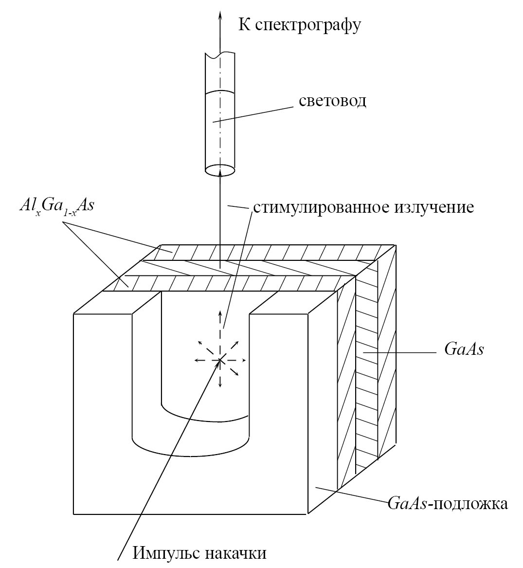 Эксперименты выполнялись на спектрофотохронометрическом лазерном пикосекундном комплексе, описанном в [1]. Исследуемый образец представлял собой гетероструктуру Al0.22Ga0.78As–GaAs–Al0.4Ga0.6As с толщиной слоев соответственно 1.3:1.5:1.2 мкм. Часть площади гетероструктуры, включая один ее торец, была освобождена от подложки. Эту часть окаймляла с трех сторон, как рама, оставшаяся часть подложки (рис. 1). Концентрации донорных и акцепторных примесей в гетероструктуре не превышали 1015 см-3. Слои AlxGa1–xAs предназначены для стабилизации поверхностной рекомбинации и механической прочности и прозрачны для света, используемого в эксперименте.