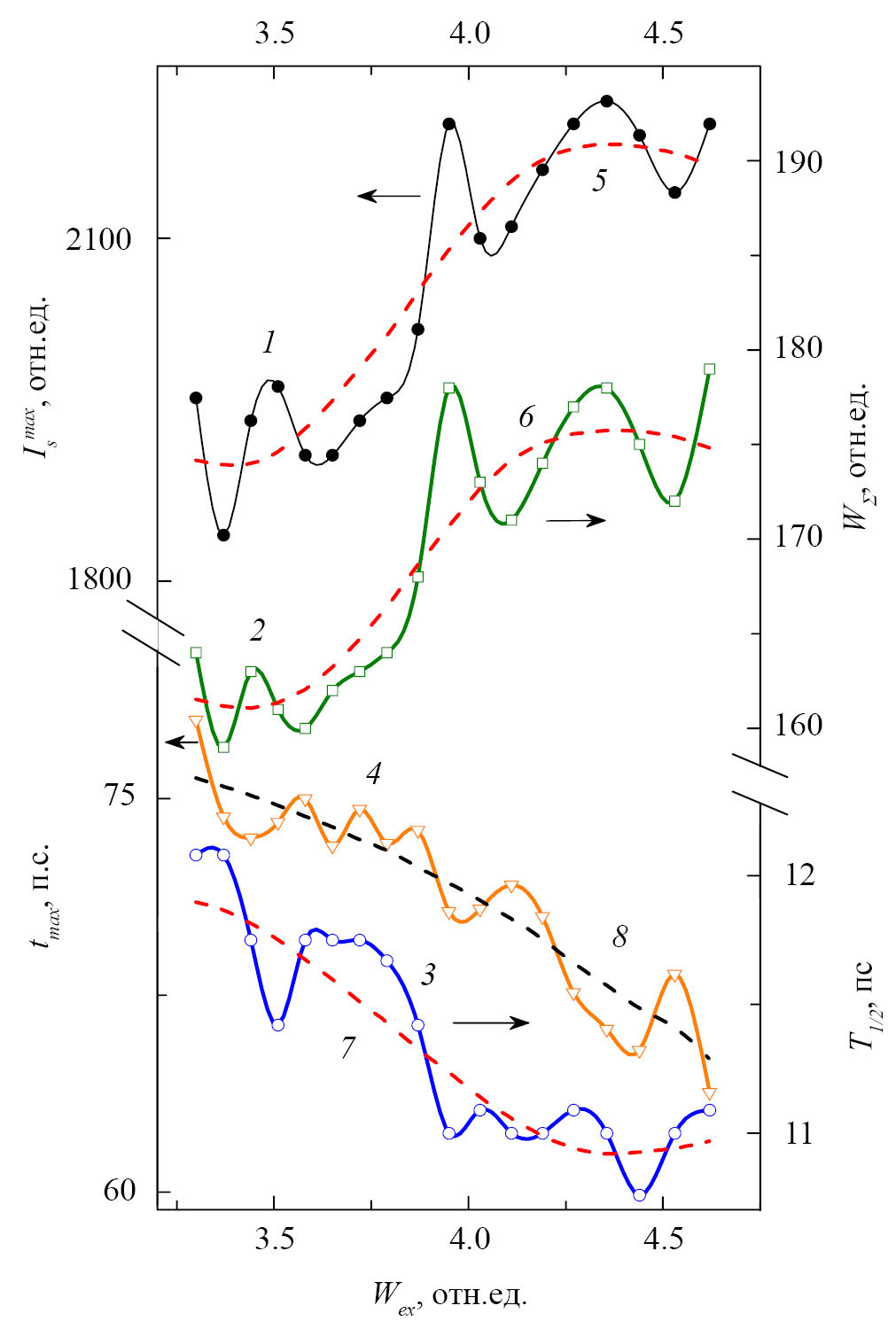Рис. 2. Зависимость от энергии накачки Wex при δY = = 110 мкм: кривая 1 — максимальной интенсивности Ismax спектральной (с ħω = 1.384 эВ) компоненты излучения (s-компоненты); кривая 2 — энергии s-компоненты WΣ, пропорциональной и поэтому определенной по площади под хронограммой; кривая 3 –длительности s-компоненты на полувысоте T1/2; кривая 4 — момента времени tmax, в который достигается максимум огибающей s-компоненты; кривые 5–8 — соответственно гладкие составляющие зависимостей 1–4.