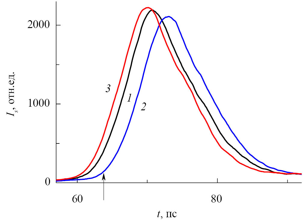 Слой GaAs подвергался оптической накачке (ехcitation) мощным световым импульсом длительностью на полувысоте (FWHM) ≈ 10 пс и с энергией фотона 1.56 эВ. Диаметр (FWHM) луча накачки и создаваемой ею активной области слоя GaAs равнялся Dex ≈ 0.5 мм. Расстояние центра активной области до освобожденного от подложки торца гетероструктуры, излучение из которого исследовалось, исходно составляло Y0 ≈ 1 мм. Уже в начале накачки в слое GaAs возникало интенсивное стимулированное пикосекундное излучение (подробнее см. [4]). Часть излучения, выходившего из торца гетероструктуры и расположенного в максимуме диаграммы направленности, попадала в кварцевый световод, по которому транспортировалась к входной щели двойного спектрографа. Промежуточная щель между первой и второй ступенями спектрографа была раскрыта так, чтобы пропускать компоненту излучения спектральной шириной 5 мэВ с максимумом при ħω = 1.384 эВ (далее — s-компонента). Спектрограф был в режиме вычитания дисперсии, чтобы на выходе из него s-компонента имела ту же форму огибающей, что и на входе. Изменение интенсивности Is со временем выделенной таким образом s-компоненты преобразовывалось в скоростной электронно-оптической камере (ЭОК) в изменение интенсивности света в пространстве, регистрировавшееся прибором с зарядовой связью (ПЗС-камерой). Полученное таким образом представление огибающей Is(t) s-компоненты далее называется хронограммой.