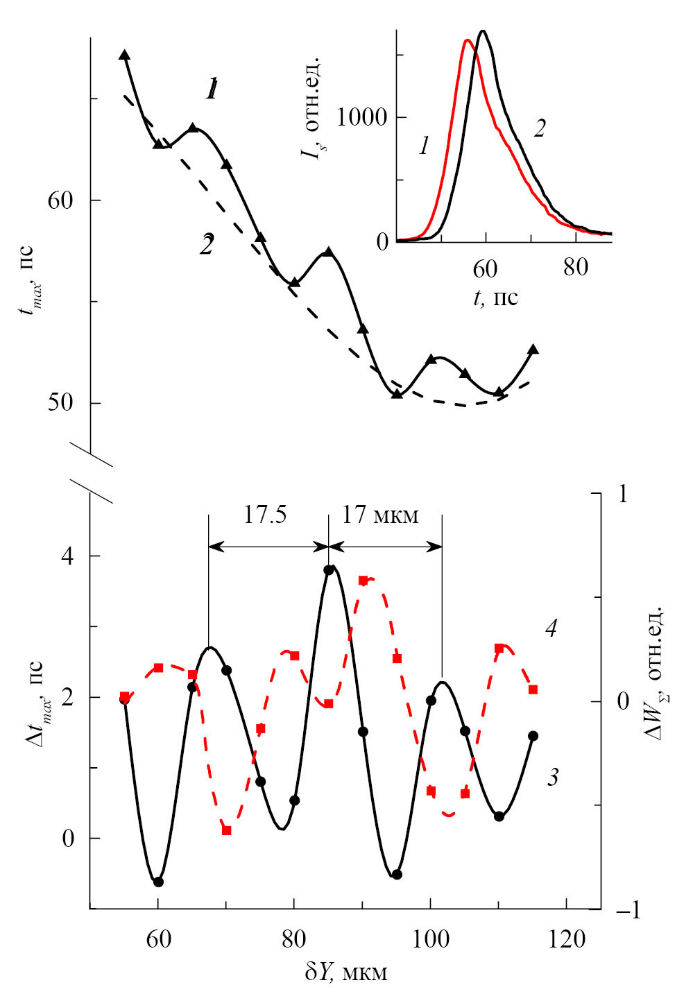 Рис. 4. Зависимость момента времени tmax от уменьшения расстояния между активной областью и торцом (сдвига) δY (кривая 1); гладкая (2) и модуляционная (3) составляющие зависимости tmax от δY; модуляционная составляющая зависимости WΣ от δY (кривая 4). На вставке — хронограммы для δY = 80 (1) и 85 мкм (2).