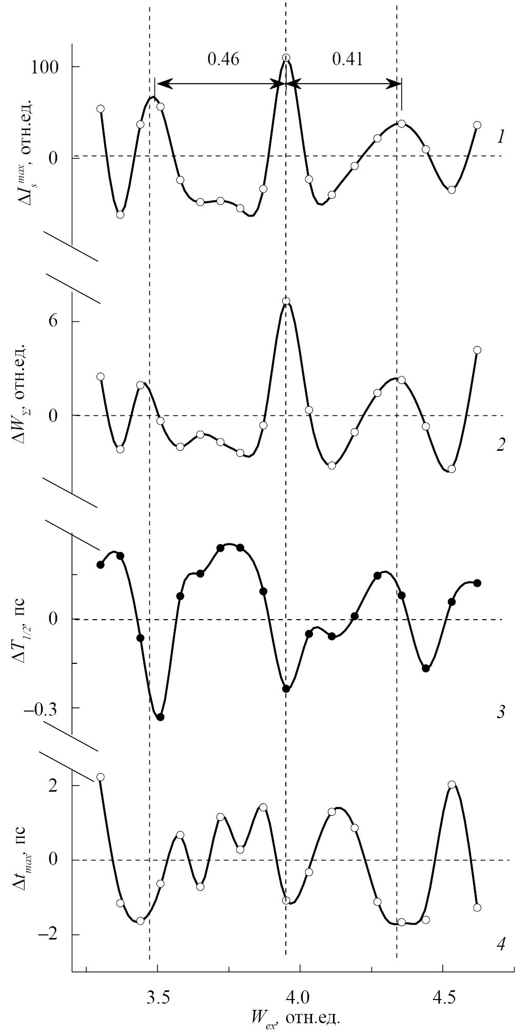 Зависимость максимальной интенсивности Ismax s-компоненты (максимума хронограммы) от энергии Wex модулирована ЛМ, разделенными интервалами ∆Wex = 0.46 и 0.41 отн.ед. (рис. 2, кривая 1). Подобно и скоррелированно с ней была модулирована зависимость W∑(Wex) (кривая 2). Немонотонно спадающими оказались зависимости длительности хронограммы на полувысоте T1/2(Wex) (кривая 3) и момента времени, на который приходится максимум хронограммы, tmax(Wex) (кривая 4).