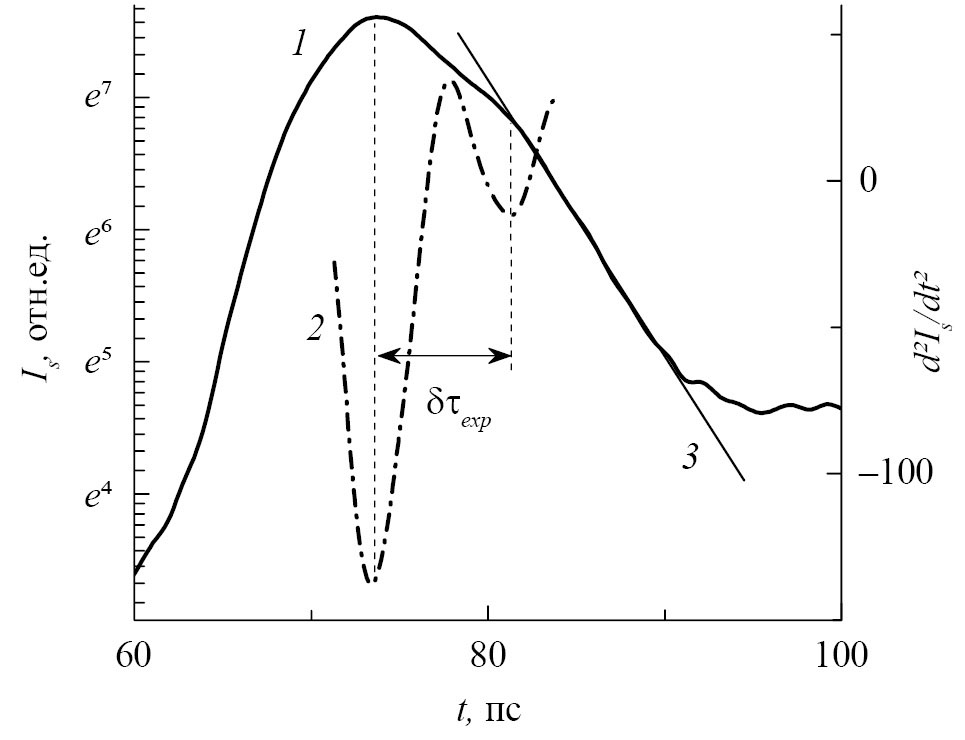 Параметром огибающей Is(t) является и время δτexp, через которое излучение, пройдя через максимум, начинает релаксировать экспоненциально с характерным временем τr — еще одним параметром. Время δτexp определялось как интервал между двумя минимумами производной dIs2/dt2 (рис. 6). Положение на хронограмме Is(t) второго минимума производной полагалось началом экспоненциальной релаксации компоненты, и время τr определялось по наклону касательной 3 к спаду хронограммы. Обнаруживается, что ЛМ на зависимостях δτexp(Wex), τr(Wex) и ΔIsmax(Wex), скоррелированы (рис. 7, кривые 1–3). Согласно [4] времена δτexp и τr возрастают с увеличением нагрева носителей. Поскольку нагрев, вызванный поглощением излучения свободными носителями, меняется с Wex соответственно изменению Ismax с Wex, то это и приводит к корреляции. А она подтверждает, что ЛМ на зависимостях δτexp(Wex) и τr(Wex), как и на зависимости ΔIsmax(Wex), вызваны РР.