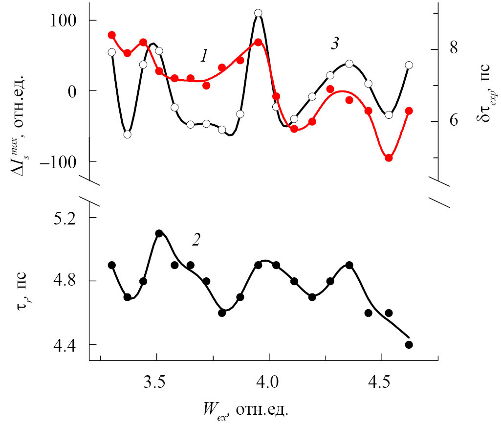На рис. 5 кривая 3 (зависимость ΔT1/2(Wex)) представляет модуляционную составляющую той зависимости T1/2(Wex), которая показана кривой 3 на рис. 2. О зависимости ΔT1/2(Wex) мы можем пока сказать лишь то, что ее локальные минимумы антикоррелируют в области Wex ≤ 4.03 отн.ед. с ЛМ зависимостей ΔIsmax(Wex) и ΔWΣ(Wex). А при Wex = 4.11 отн.ед. уже ЛМ зависимости ΔT1/2(Wex) коррелирует с ЛМ на зависимостях ΔIsmax(Wex) и ΔWΣ(Wex). Таким образом, экстремумы зависимости ΔT1/2(Wex) возникают при тех Wex, при которых возникают РР. Но почему в одном диапазоне Wex это минимумы, а в другом диапазоне Wex максимумы, это вопрос к будущим экспериментам. Хотя можно отметить, что указанная антикорреляция наблюдается при тех Wex = 3.46 и 3.95 отн.ед. и Lo, при которых отношение 2(Y0 — δY)/Lо равно 9.08 и 9.8, и оно, соответственно, ближе к целому числу, т.е. к условию (7). Наоборот, корреляция наблюдается при Wex = 4.33 и Lo, при которых отношение 2(Y0 — δY)/Lо = 10.5, соответствует условию (5). Поэтому, возможно, процесс генерации излучения при условии (5) и (7) по-разному влияет на время Т1/2. Но это, как и еще некоторые пока не обсуждавшиеся особенности приведенных графиков, может быть объяснено только при дальнейших исследованиях.