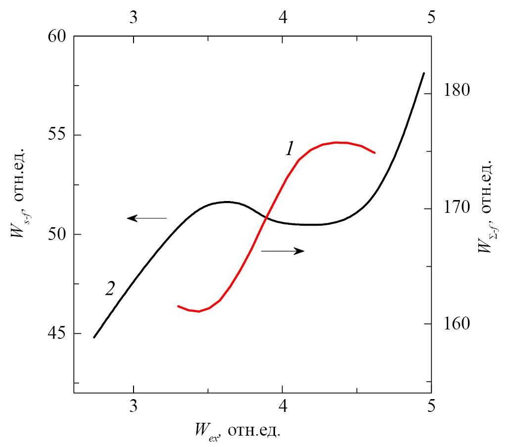 Рис. 8. Гладкая составляющая f зависимости от энергии накачки Wex энергии WΣ s-компоненты при δY = 110 мкм (кривая 1) и энергии Ws s-компоненты, измеренной в [3] при δY = 160 мкм (кривая 2).