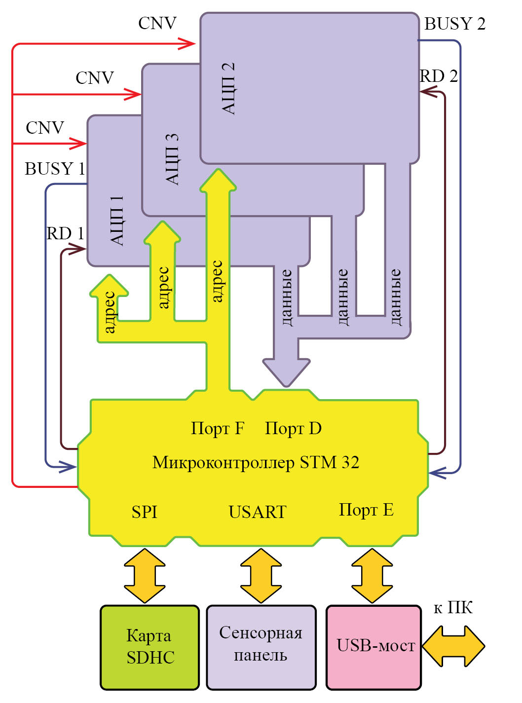 В процессе проектирования, была разработана структурная схема ССД (рис. 3). Ядром структуры является микроконтроллер семейства ARM модели STM32F767. В процессе работы системы параметры регистрации задаются с помощью сенсорной панели и считываются микроконтроллером с использованием интерфейса USART. Карта SDHC предназначена для записи или чтения интерферограмм, она подключена к МК через интерфейс SPI. Микросхемы АЦП в процессе работы преобразуют аналоговый сигнал интерферограмм в цифровой для дальнейшей обработки в ПК. АЦП запускаются сигналами CNV и RD. После завершения оцифровки данных микросхемы АЦП поочередно отправляет на МК сигналы BUSY. Обмен данными между МК и АЦП осуществляются через порты F и D. МК передает и принимает информацию через USB-мост по цифровому порту Е. Подключение ПК к устройству осуществляется через USB-мост.