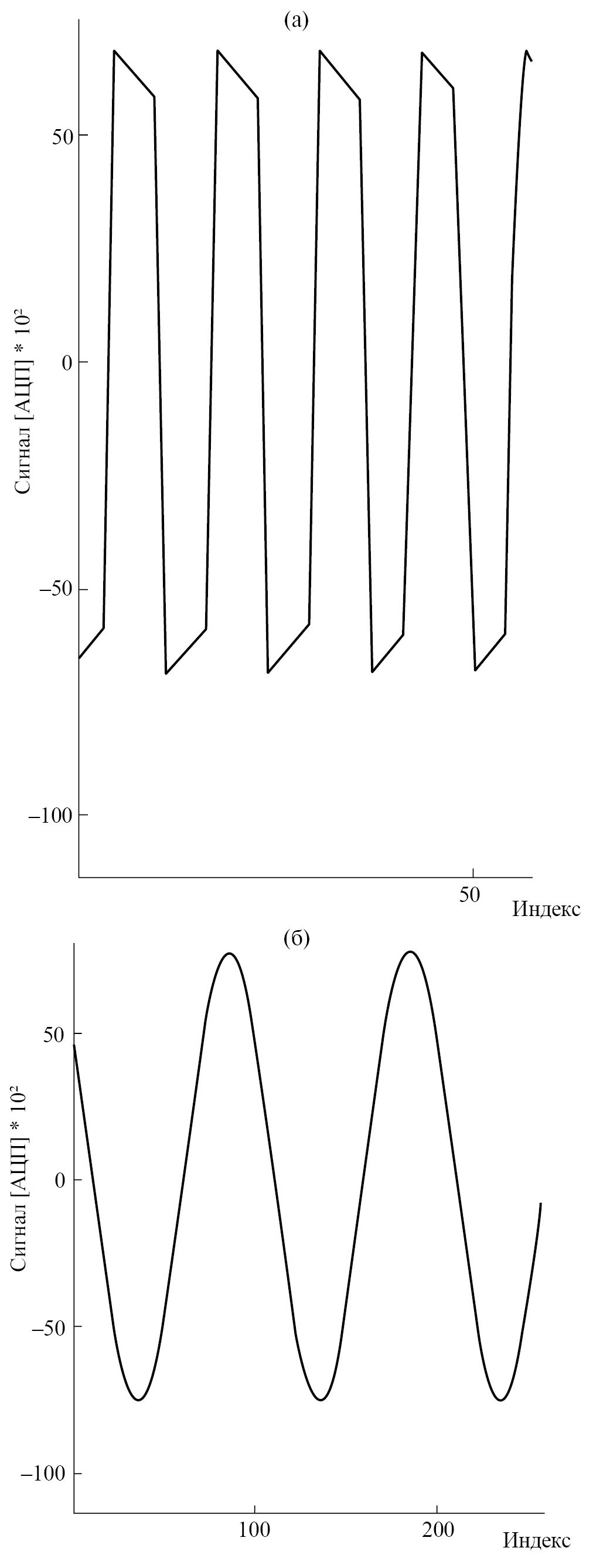 Рис. 5. Программное выделение сигнала меандра по первому каналу (а) и синусоиды по второму каналу (б).