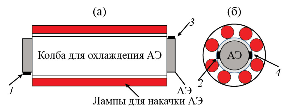 Рис. 1. Расположение активного элемента в квантроне и два варианта (а, б) размещения УЗ-датчиков (1–4).