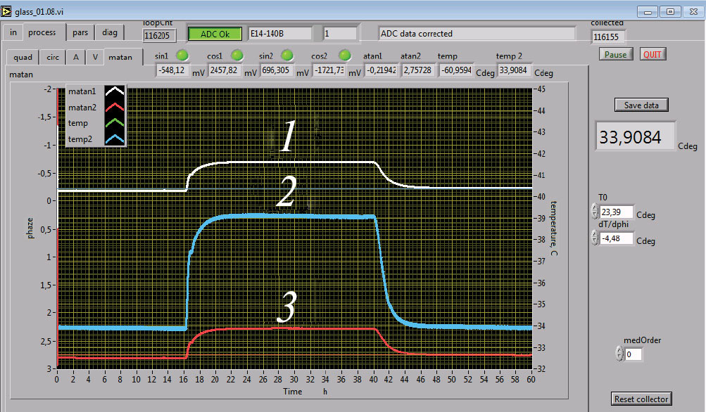 Программное обеспечение осуществляет фильтрацию и запись сигналов (1), (2) и сигнала температуры, вычисление фазы сигналов в соответствии с выражением (3), хранение данных и отображение осциллограмм (рис. 4).