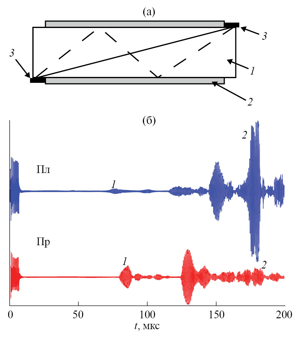 Рис. 5. Схема зондирования (а) вдоль АЭ напрямую (сплошная линия) и при отражении волны от границ АЭ (пунктирная линия): 1 – АЭ, 2 – колба охлаждения, 3 – приемный и передающий УЗ-датчики; типичные осциллограммы (б) принятых УЗ-сигналов для плоских датчиков (Пл) и для датчиков на призмах (Пр): 1 – прямая продольная волна, 2 – поперечная отраженная волна.