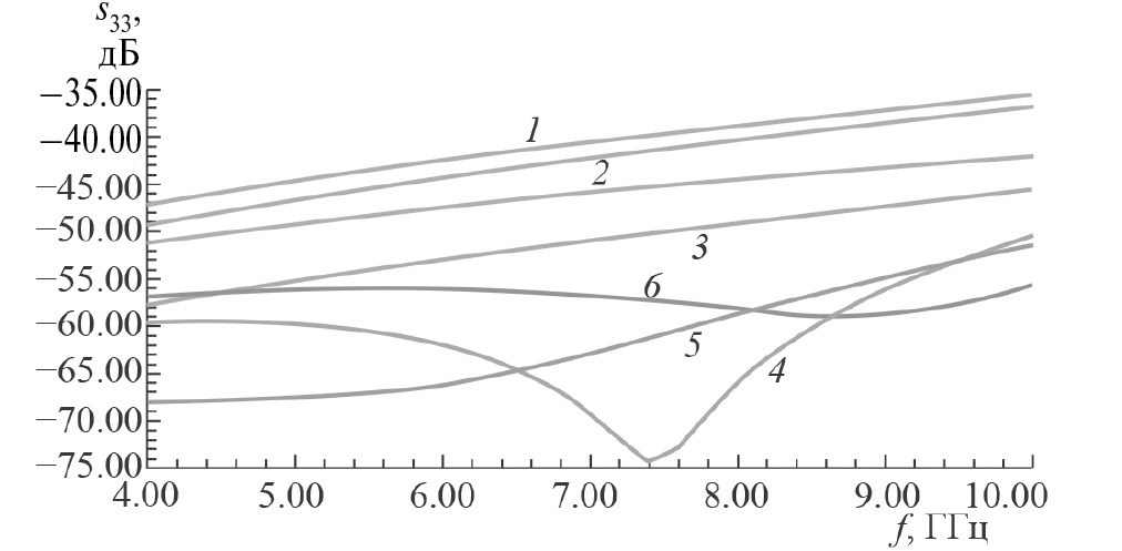 На рис. 14 показана результирующая частотная зависимость указанного коэффициента отражения. Кривая на рис. 14 получена для Lq1, 2 = 10.3, w1, 2 = 5.3, ws = 2, h1 = 0.5, h2 = 1.5. Видно, что практически во всем частотном диапазоне 4 … 10 ГГц переход согласован на уровне –20 дБ. Качество согласования может быть улучшено за счет увеличения числа секций перехода.