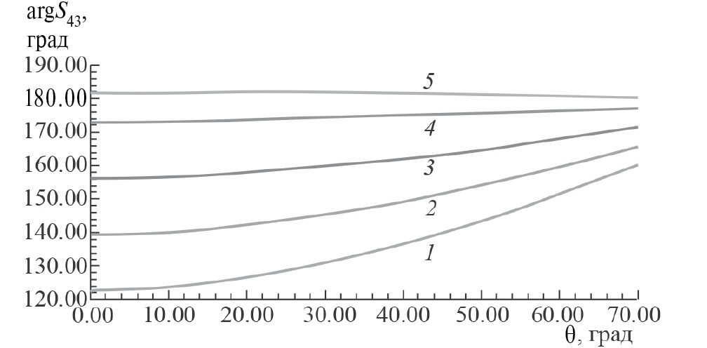 На рис. 7 представлена зависимость фазы коэффициента передачи первого ОДПЗ от угла падения, полученная на частоте 7 ГГц для геометрических параметров, приведенных выше, s2 = 1.2 и Lr1 = 3, 2, 1, 0, −1. Видно, что минимальные изменения фазы имеют место при Lr1 = 1.
