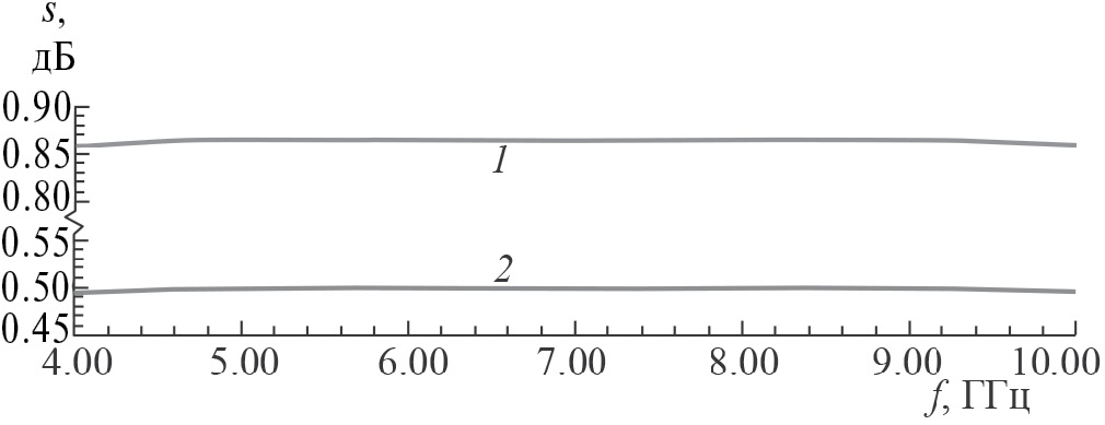 Рис. 15. Частотная зависимость коэффициентов передачи S11, 2 (1) и S11, 3 (2).