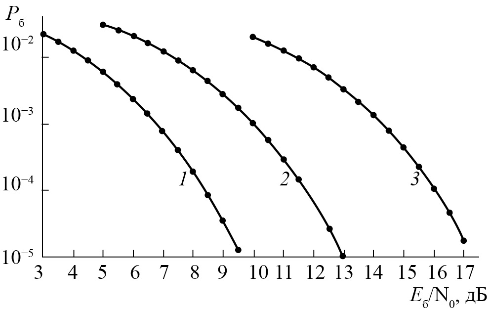 На рис. 1 приведены вероятности ошибки Pб, вычисленные с использованием соотношений (8), (9), (10) для сигналов ФМ-4, ФМ-8, ФМ-16 при передаче по каналу АБГШ: для вероятности Pб = 10–5 требуются значения Eб / N0, равные 9.5, 13.0 и 17.25 дБ соответственно.