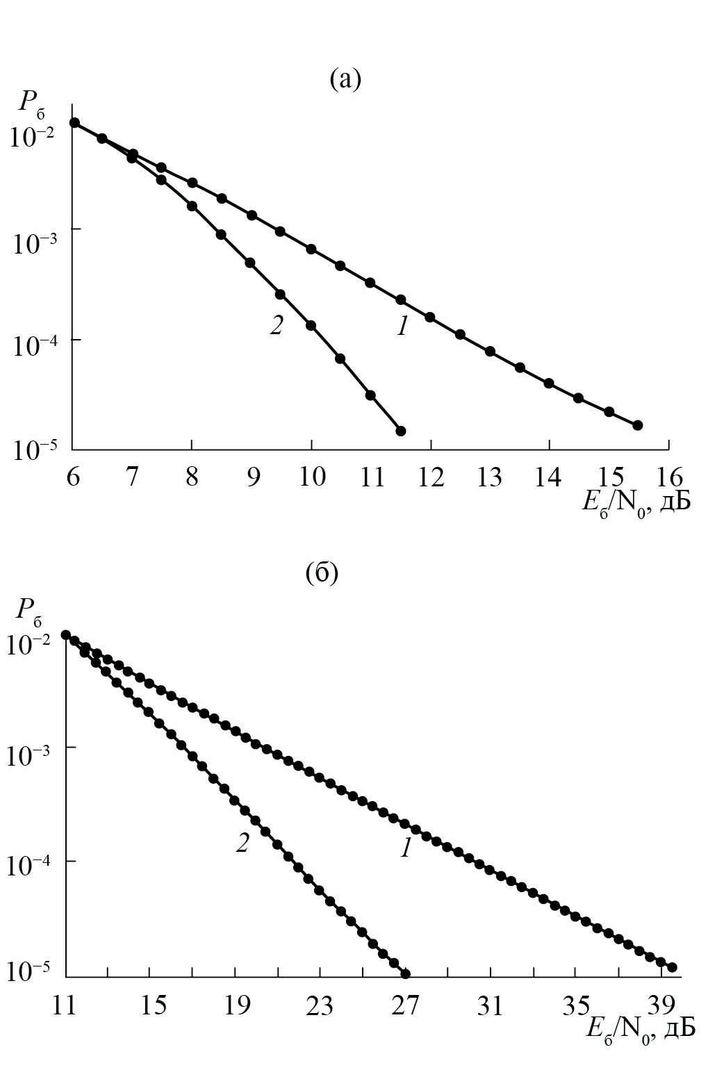 На рис. 2–4 приведены вероятностные кривые Pб для посимвольного приема рассматриваемых сигнальных конструкций – кривые 1 и 2 соответствуют вероятностям Pб без применения и с применением корректирующего кодирования для каналов АБГШ с замиранием с параметрами сцинтилляции трансионосферного канала S4 = 0.3 (см. рис. 2а, 3а, 4а) и S4 = 0.6 (см. рис. 2б, 3б, 4б). Для канала с замиранием с параметром S4 = 0.3 вероятность ошибки Pб = 10–5 при посимвольном приеме сигналов без использования корректирующего кодирования достигается при значениях Eб / N0, равных 16.0, 19.0 и 23.0 дБ соответственно (энергетические потери по отношению к АБГШ каналу без замираний составляют 6.5, 6.0, 5.75 дБ). Для параметра данная вероятность ошибки достигается при значениях 39.5, 43.0 и 45.0 дБ соответственно (энергетические потери по отношению к АБГШ каналу без замираний составляют 30.0, 30.0 и 27.75 дБ).