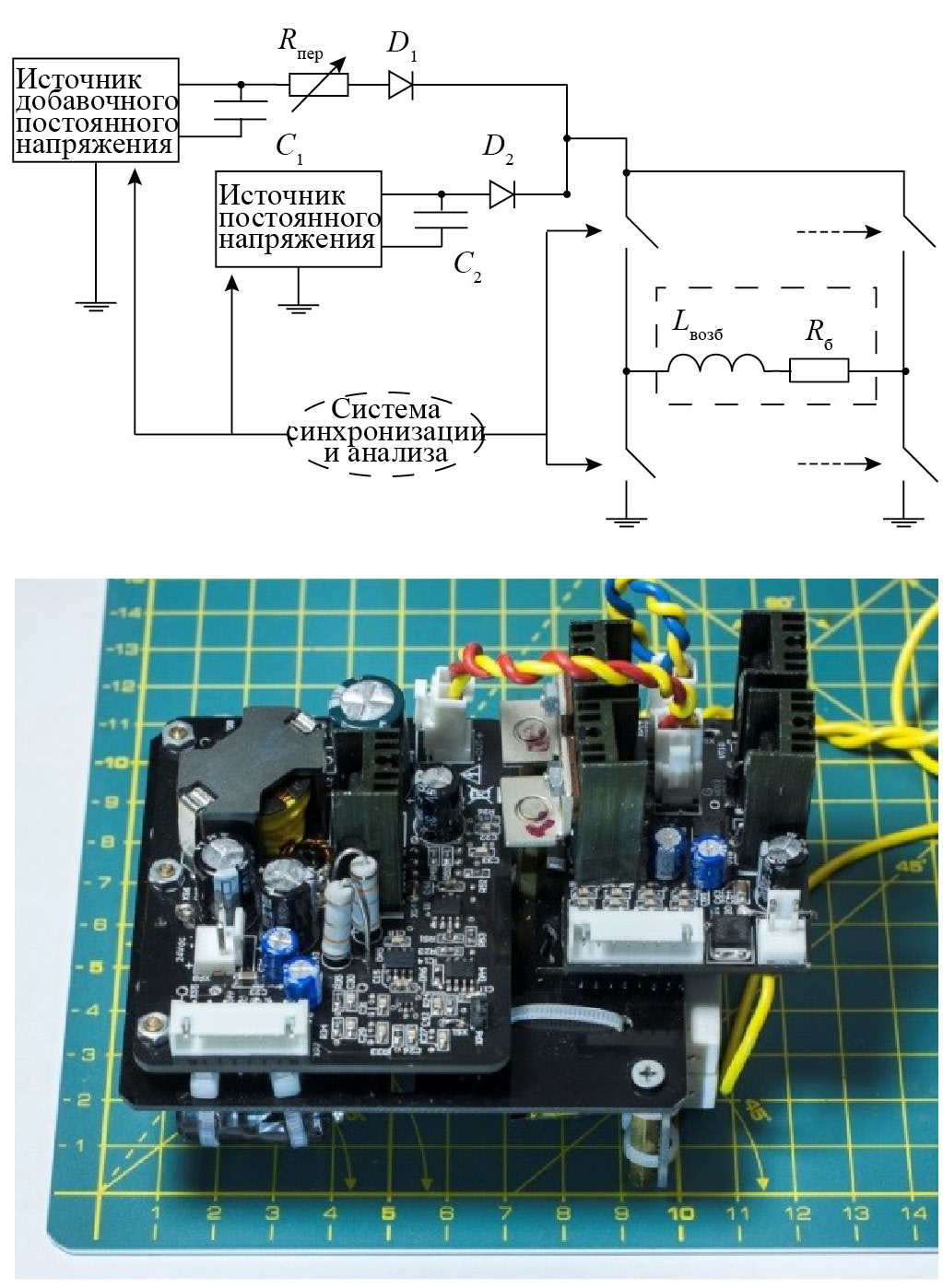 Система возбуждения состоит из основного и добавочного источников постоянного напряжения, возбуждающей катушки Lвозб, балластного резистора Rб, коммутирующих элементов Switch (образующих транзисторный H-мост) и вспомогательных электрических элементов C1, C2, D1, D2, Rпер.