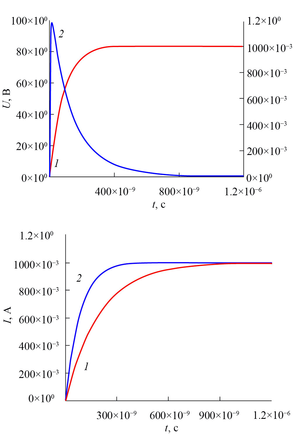 Следует отметить, что при проведении контроля композиционных объектов, состоящих из тонких слабопроводящих слоев, основной технической сложностью является необходимость снижения значения начальной глубины проникновения вихревых токов в объекте путем формирования прямоугольных импульсов тока с коротким фронтом в нагрузке, носящей индуктивный характер. Большинство современных сильноточных элементов коммутации, используемых в выходных каскадах импульсных вихретоковых генераторов, обеспечивают длительности процессов переключения порядка 20 нс. Однако ввиду того, что нагрузка генератора носит индуктивный характер, время нарастания тока возбуждения в ней больше, чем время нарастания приложенного напряжения. При длительности переднего фронта напряжения возбуждения, равной 20 нс, длительность возбуждающего тока в датчике (со значением индуктивности около 10 мкГн и сопротивлением порядка 10 Ом) составляет не менее 1.3 мкс, что недопустимо при контроле тонкослойных объектов.