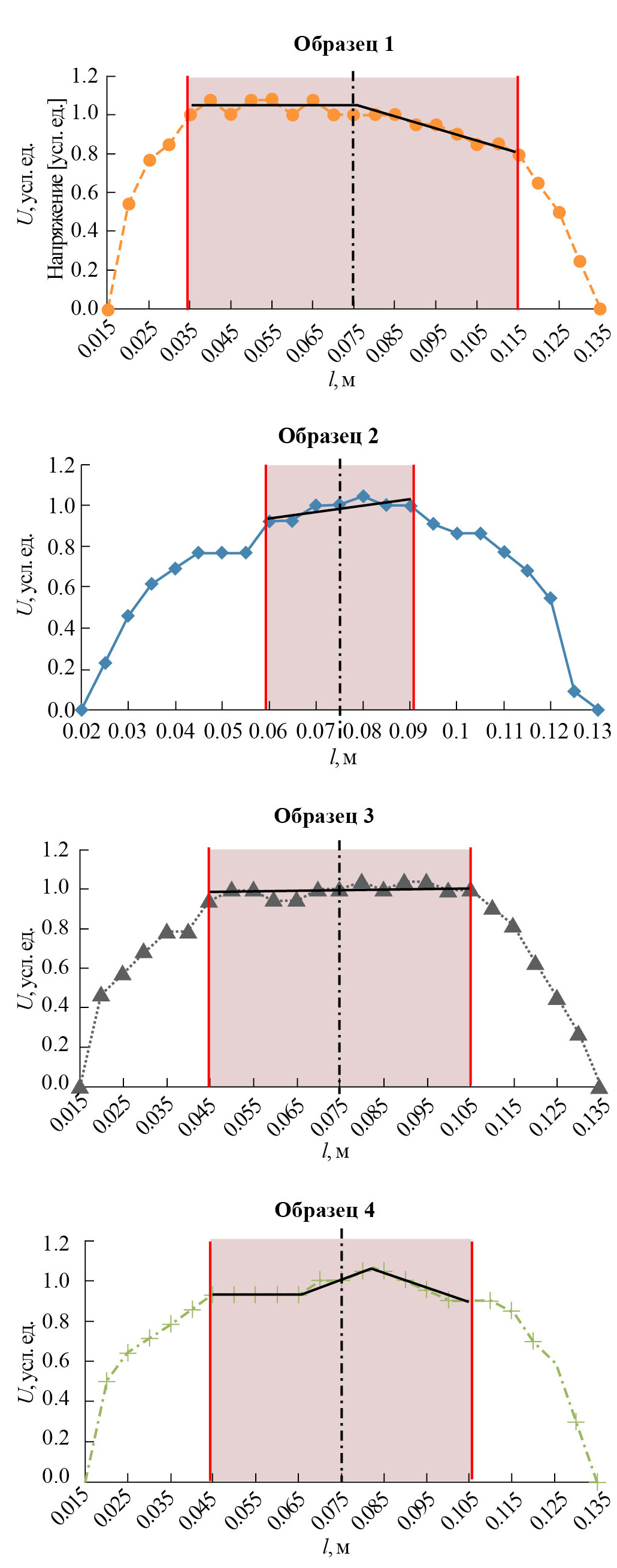 По измерениям дифференциального сигнала с учетом фиксируемых координат положения датчика были получены диаграммы электромагнитного отклика продольных срезов образца. При приближении датчика к дефекту амплитуда дифференциального сигнала нелинейно возрастает, а при его заходе на искусственный дефект практически не претерпевает изменений, образуя плато (рис. 7), соответствующее максимальному значению напряжения.