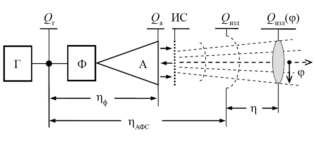 Схема включает генератор (Г), фидер (Ф), антенну (А), поверхность ИС, которая представляет собой область пространства, заполненную токами, возбуждающими электромагнитные волны [1]. Введены следующие обозначения: Qг и Qа – энергия электрического импульса генератора и электромагнитного импульса на апертуре антенны, Qизл – полная энергия излучения, Qизл(φ) – энергия излучения внутри телесного угла с раскрывом ±φ и осью, совпадающей с главной осью излучения антенны, η = Qизл(φ)/Qизл – доля энергии излучения, ηф = Qа /Qг и ηАФС = Qизл /Qг – энергетическая эффективность фидера и антенно-фидерной системы излучателя.