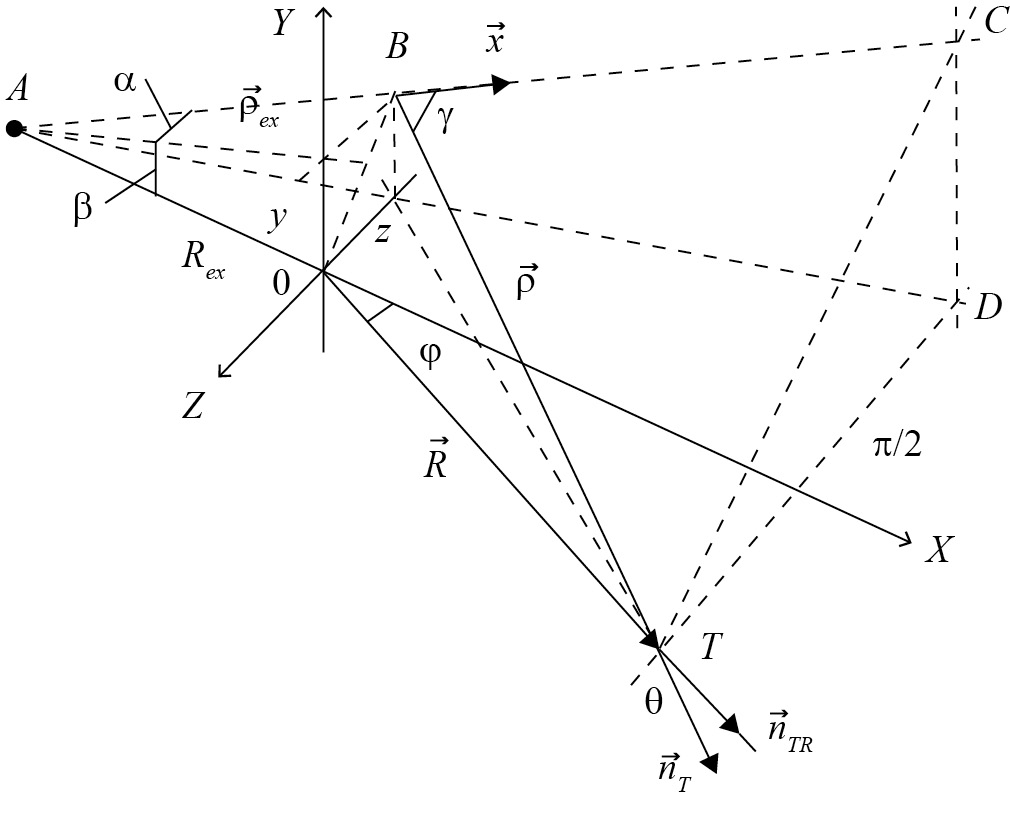 Рассмотрим схему возбуждения плоской апертуры и формирования излучения (рис. 2). Поместим апертуру в плоскости YZ декартовой системы координат. Ограничим апертуру прямоугольной формы симметричными границами ±Ay /2 и ±Az /2 по осям Y и Z соответственно. На схеме представлены: A(–Rвоз, 0, 0) – точка, из которой осуществляется возбуждение апертуры, B(0, y, z) – точка на ее поверхности, α и β – направление наблюдения точки B(0, y, z) из точки A, γ – угол между направлением векторов и , T(R, φ) – точка наблюдения параметров излучения в плоскости y = 0.