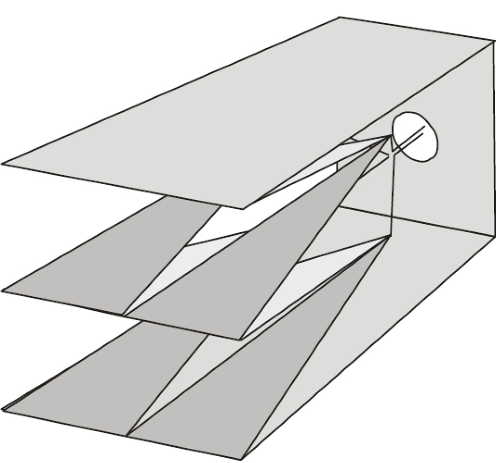Пусть из точки A к апертуре распространяется поперечная электромагнитная (ЭМ) волна, поляризованная в плоскости, ортогональной поверхности y = 0. Пусть эта волна ограничена пределами пирамиды, основанием которой является апертура антенны, а поверхности двух граней пирамиды, которые симметричны относительно поверхности y = 0, электропроводны. Такая схема представляет собой модель регулярного TEM-рупора с волновым импедансом Zа =const. Значение Zа может быть вычислено в микрополосковом приближении или принято в соответствии с [10], где также показано, что значение импеданса устанавливается на квазистационарном уровне при длине Rвоз более 5λ.