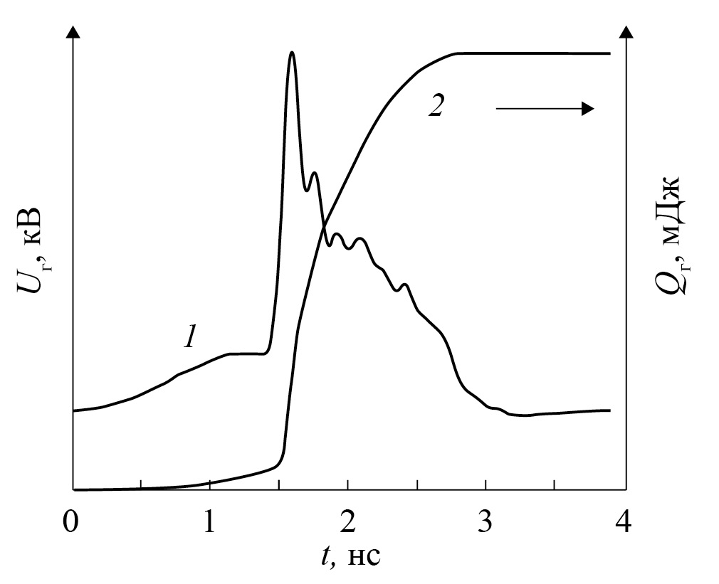 Рис. 4. Импульс возбуждения антенны (1) и энергия импульса (2).