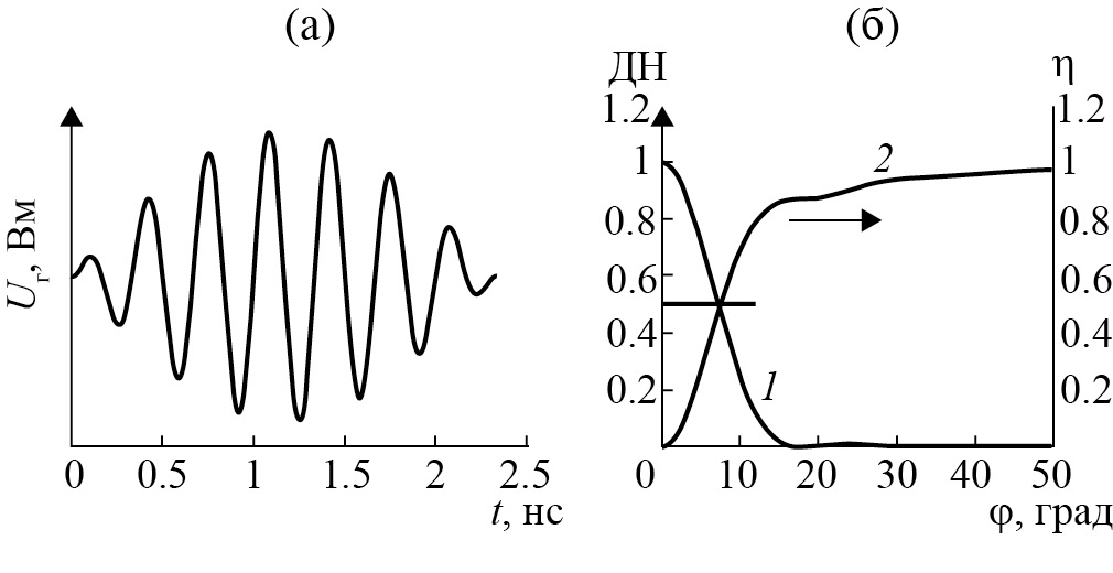 Рис. 7. Импульс возбуждения (а), ДН круглой синхронной апертуры (б, кривая 1), доля энергии излучения η(φ) внутри конуса с углом раскрыва ±φ (б, кривая 2).