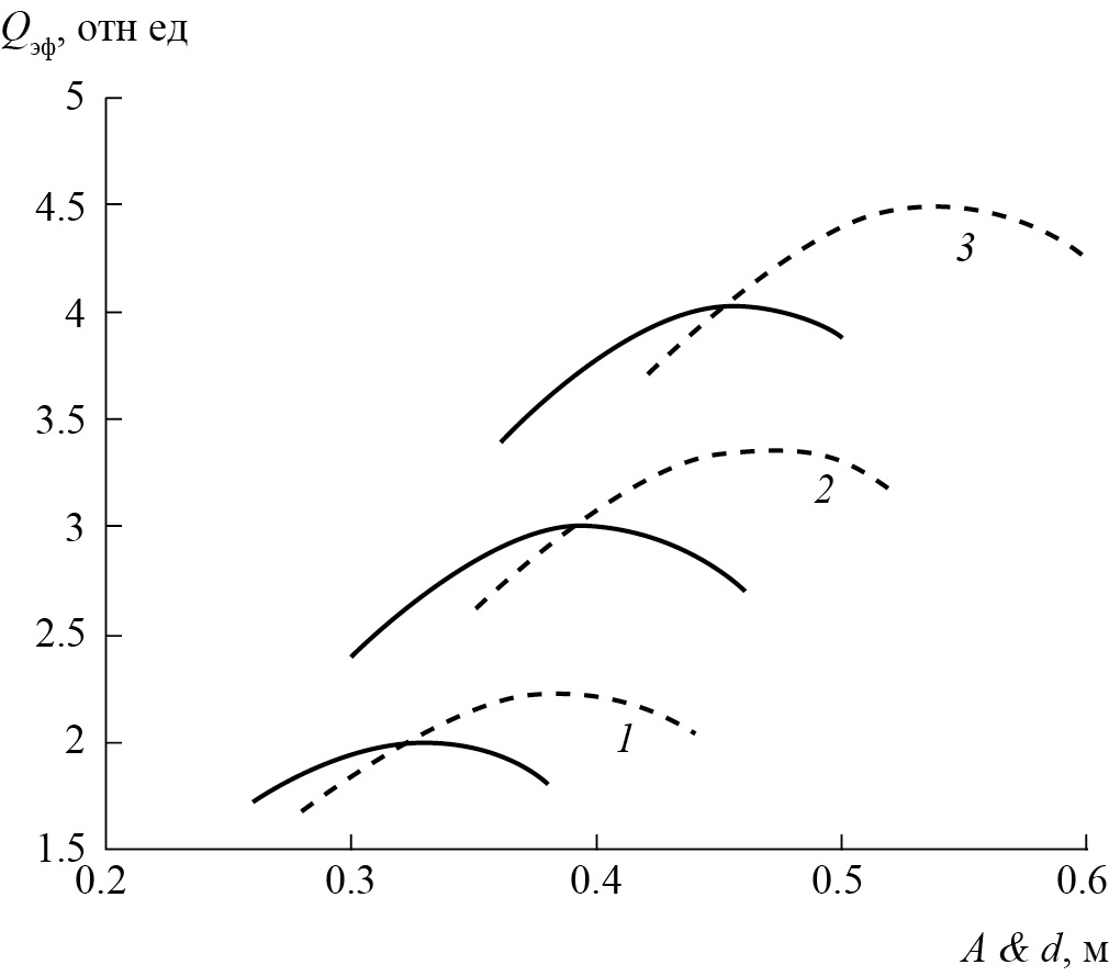 Рис. 9. Нормированная зависимость энергии Qэф от размера апертуры при Rвоз = 0.5 (1), 0.75 (2) и 1 м (3): сплошная линия – апертура квадратная, пунктир – круглая.