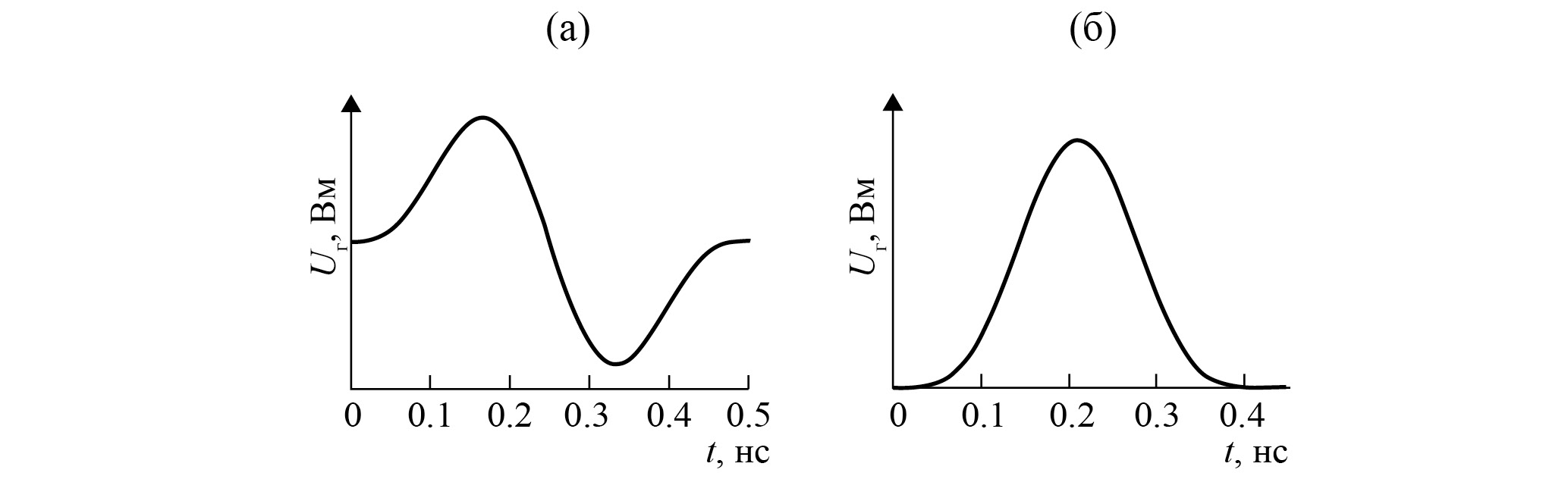 Рис. 10. Импульс возбуждения антенны в форме моноцикла (а) и Гаусса (б).
