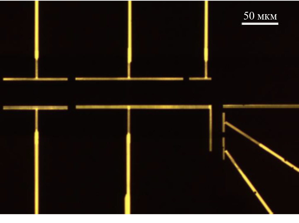 В результате получали длинные мостики длиной 20–250 мкм, шириной 8–100 мкм с ровными краями и направлением с большой точностью ориентированно вдоль и поперек скольжения ВЗП. Наличие двух видов мостиков (параллельных и перпендикулярных) дает возможность исследовать транспортные свойства пленок как вдоль, так и поперек направления движения ВЗП. Кроме того, такая структура позволяет исследовать образец в случае неверно выбранного направления скольжения ВЗП или использования структурно несовершенного кристалла с эффектом двойника (по толщине два разориентированных кристалла), где ВЗП может двигаться в двух направлениях, но при этом для срыва ВЗП требуются большие пороговые поля, что приводит к излишнему джоулеву нагреву.