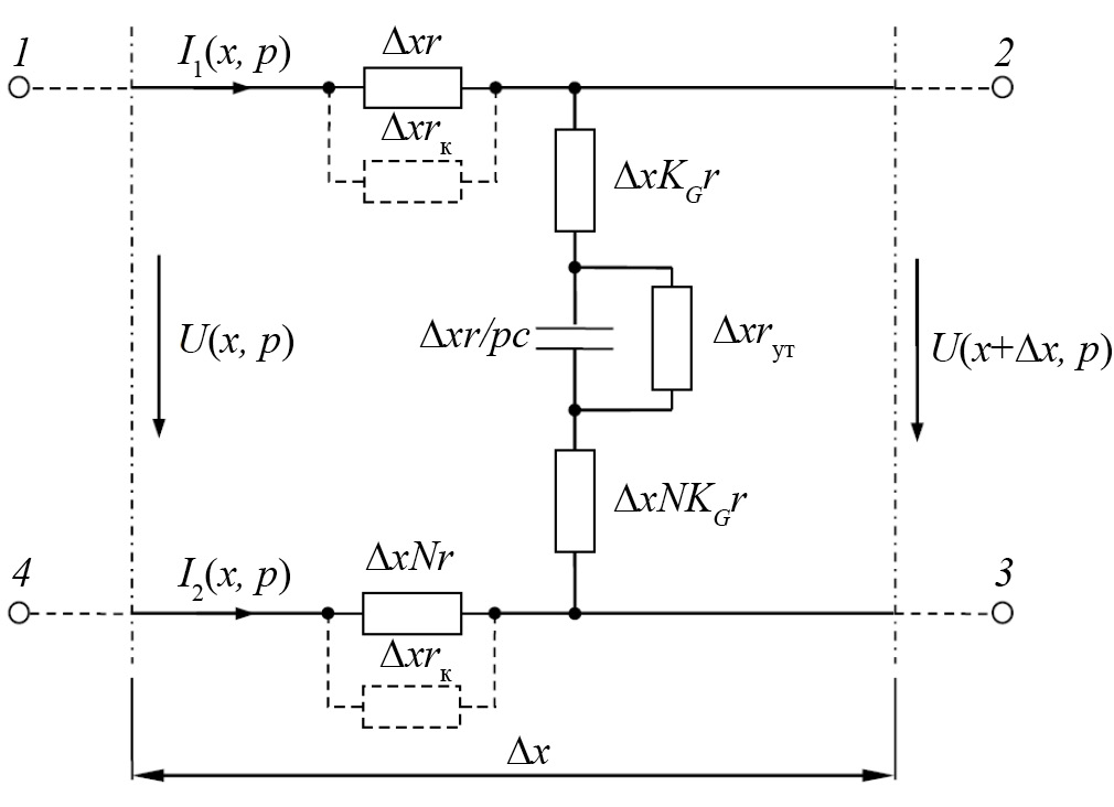 На рисунке введены следующие обозначения: р – комплексная частота, r – погонное сопротивление резистивного слоя R, с – погонная емкость конденсатора, который получается между резистивными слоями, KG – безразмерный коэффициент, численно равный отношению погонного сопротивления переходного слоя G к погонному сопротивлению резистивного слоя R, N – безразмерный коэффициент, численно равный отношению погонных сопротивлений верхнего и нижнего резистивного слоев, rут – погонное сопротивление утечки диэлектрика, rк – погонное сопротивление материала контакта. Сопротивления контактов (см. рис. 2, пунктир) учитываются только в КЭ приконтактных областей конструкции ОСО R-C-NR ЭРП.