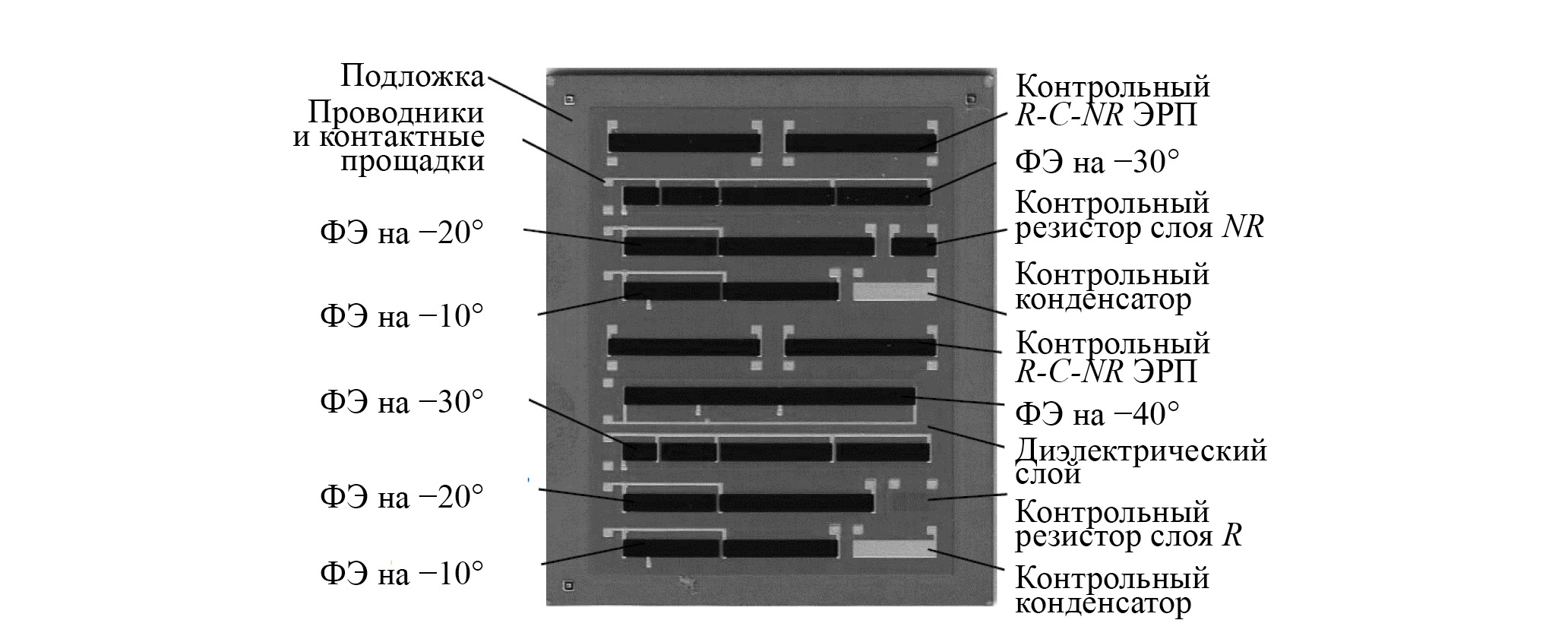 Все ФЭ были размещены на одной стандартной подложке из алюмооксидной керамики марки ВК-94 (Al2O3 94.4% (технические условия 11–78 аЯ0.027.002 ТУ)) размером 48×60 мм с необходимыми элементами для контроля параметров слоев в процессе изготовления и для определения параметров ФЭ после его изготовления. Вид подложки с толстопленочными ФЭ и контрольными элементами приведен на рис. 4.