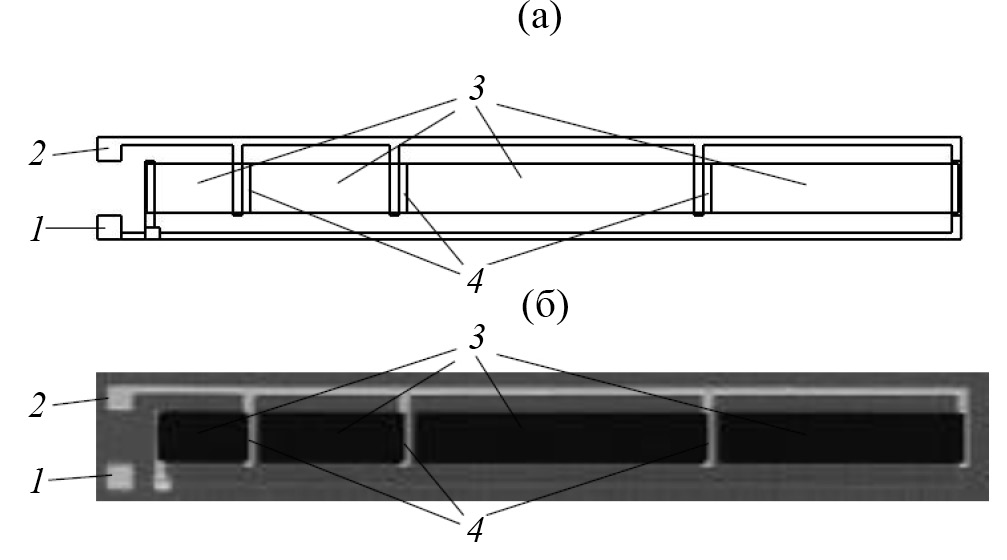 Рис. 6. Фрактальный элемент на основе ОСО R-C-NR ЭРП с постоянством фазы φZвх = –30°: а – топологический чертеж; б – фото изготовленного образца; 1 – проводники с контактами к нижнему резистивному слою (слой R), 2 – проводники с контактами к верхнему резистивному слою, 3 – верхний резистивный слой (слой NR), 4 – зазоры в верхнем резистивном слое.