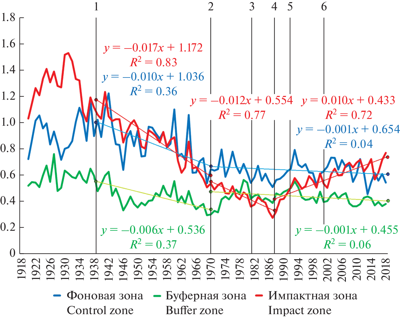 —We studied the influence of meteorological factors and aerotechnogenic pollution on the radial growth of Scots pine (Pinus sylvestris L.) depending on the distance from the mining and metallurgical combine “Pechenganickel” (Nikel, Murmansk region). According to the content of the main polluting elements (S, Ni and Cu) in the forest litter, we identified three zones of the pollution gradient – control, buffer and impact zones. We found a significant weakening of pine stands in the impact zone due to the integrated effect of – long-term exposure to pollution (since the 1970s) and unfavorable weather events in the mid-1980s. As the emission decreased over the period 1988–2018, we observed the significant increase (up to 44%) in the radial increment of P. sylvestris in the impact zone and no meaningful changes in control and buffer ones. Further, the radial increment of trees in the impact zone reached and even exceeded the values in control conditions, despite the relatively high age of the studied trees. This indicated the high adaptive capacity of P. sylvestris.