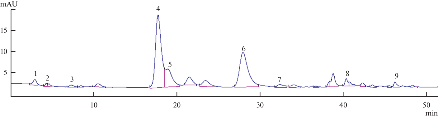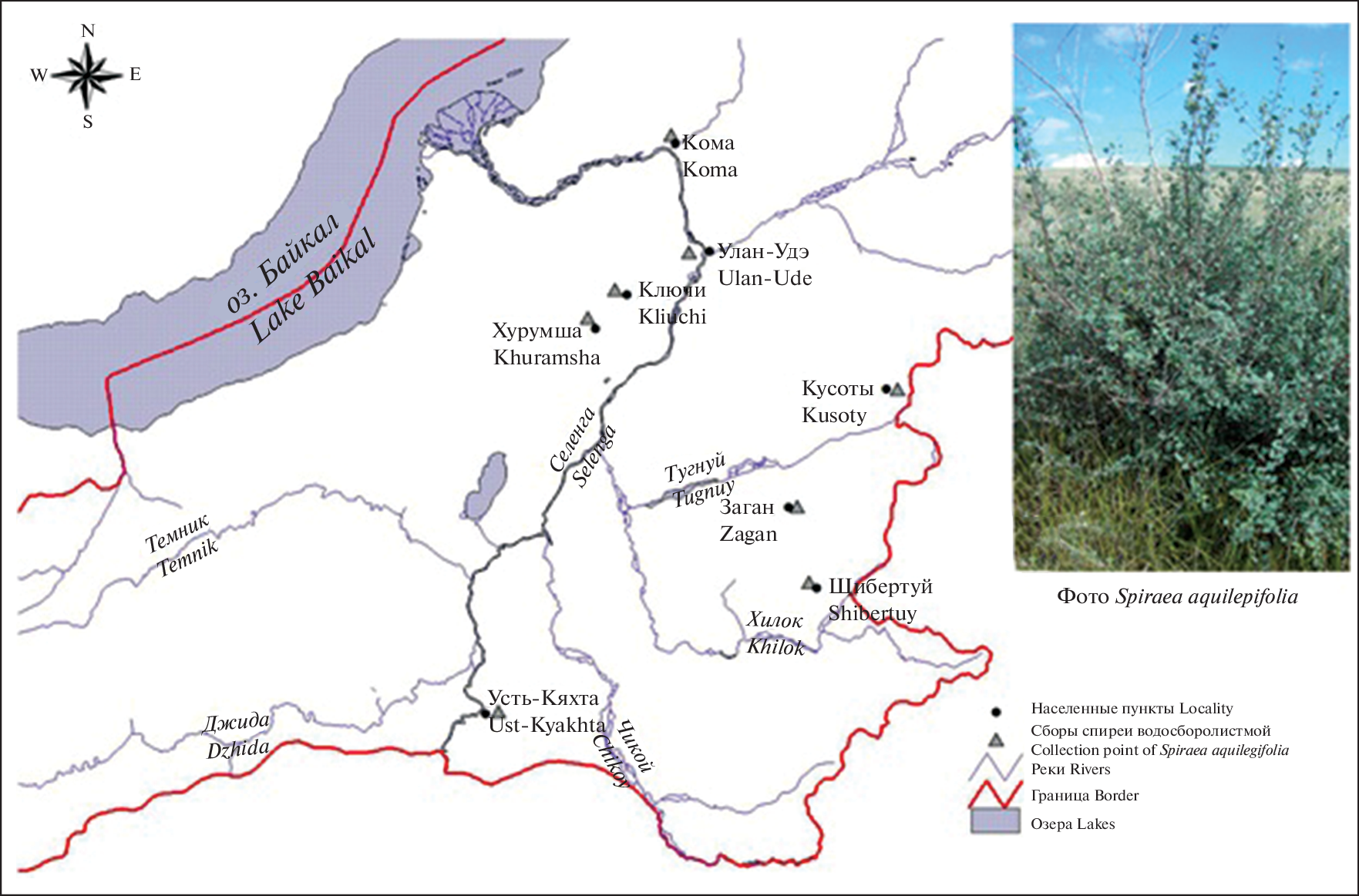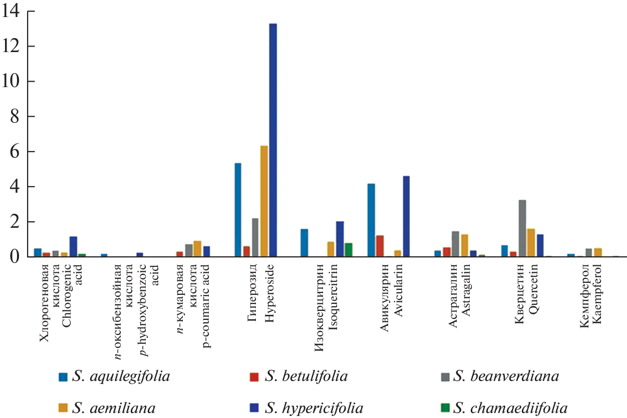 Abstract—Composition and content of flavonoids and phenol carboxylic acids in the leaves of Spiraea aquilegifolia Pall. from natural populations of the Republic of Buryatia (Western Transbaikalia) are given in the article. Aqueous ethanol (40%) extracts from raw materials were used for chromatographic study of phenolic compounds. The analysis of phenolic compounds was carried out on an analytical High-Performance Liquid Chromatography (HPLC) system consisting of an Agilent 1200 liquid chromatograph (USA) with a diode array detector, an autosampler, and a system for collecting and processing chromatographic data ChemStation. At least 24 phenolic compounds were identified in aqueous ethanol extracts from Spiraea aquilegifolia Pall. leaves by HPLC. Three acids (chlorogenic, p-coumaric and p-hydroxybenzoic) and six flavonols (hyperoside, isoquercitrin, avicularin, astragalin, quercitrin and kaempferol) were identified among them. Flavonols hyperoside (2.9–8.2 mg/g), avicularin (3.0–5.8 mg/g) and isoquercitrin (0.8–2.5 mg/g) are the main substances in aqueous ethanol extracts from leaves. Plants from populations located at the northern distribution limit in the Western Transbaikalia have a higher content of phenol carboxylic acids (near the village Koma) and flavonols (near the village Klyuchi). Plants from populations located to the eastern limit (near villages Kusoty and Zagan) have the lowest concentration of identified phenolic compounds. A high and very high level of interpopulation variability of the studied biochemical parameters has been established. This can be explained by the functional significance of the identified compounds and their active participation in general metabolic processes in the plant. The content of identified free phenolic acids and flavonols in S. aquilegifolia was characterized by medium and high levels, compared to other studied Spiraea species. This confirms the prospects for further study of the composition of phenolic compounds of S. aquilegifolia.