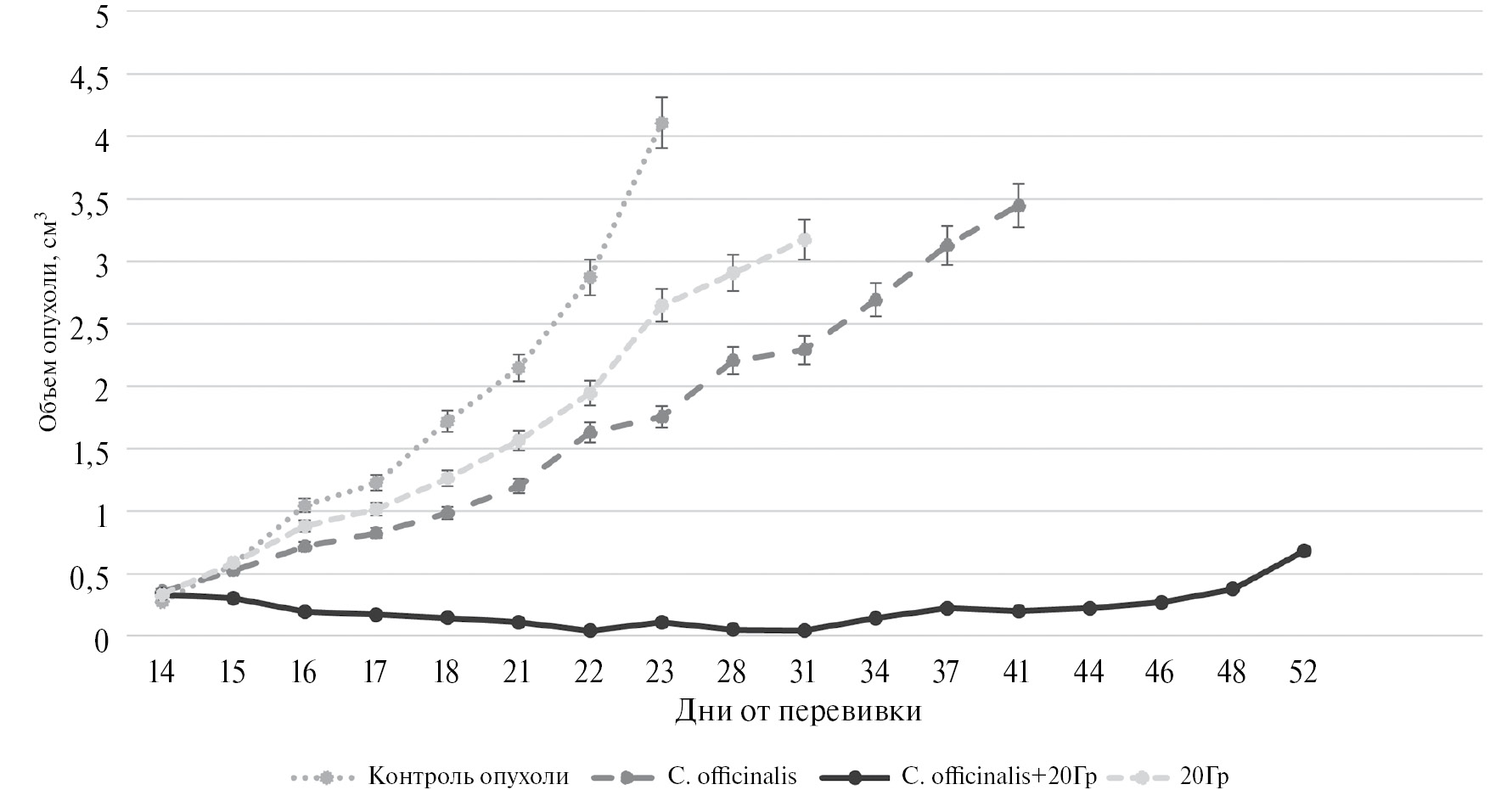 В эксперименте in vivo C. officinalis вводили в дозе 20 мг/кг подкожно в холку с последующим облучением. В предварительных экспериментах было использовано как подкожное, так и интратуморальное введение препарата (данные не приведены). Однако поскольку интратуморальное введение приводит к нарушению целостности опухоли и менее перспективно с точки зрения терапии, остановились на подкожном введении препарата.