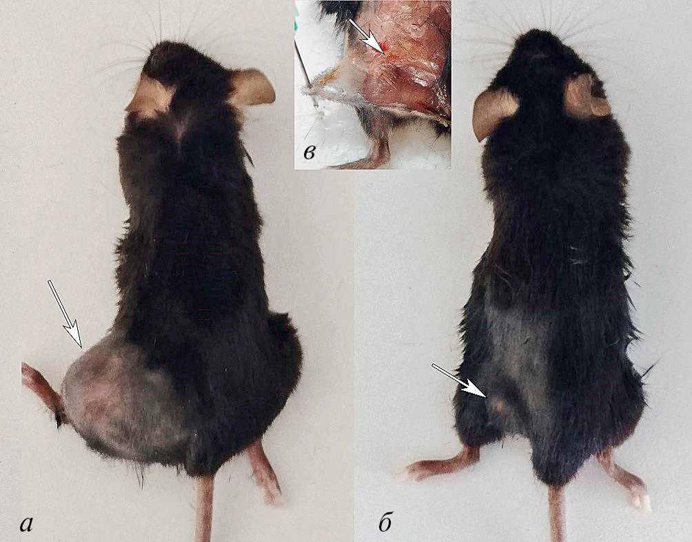 Fig. 8. A – control tumor on day 18 after grafting, Б – 31 days after grafting, 22 days after exposure to 20 Gy of γ-radiation in combination with Calendula officinalis pre-treatment, В – site of tumor inoculation 22 days after irradiation in combination with Calendula officinalis pre-treatment.