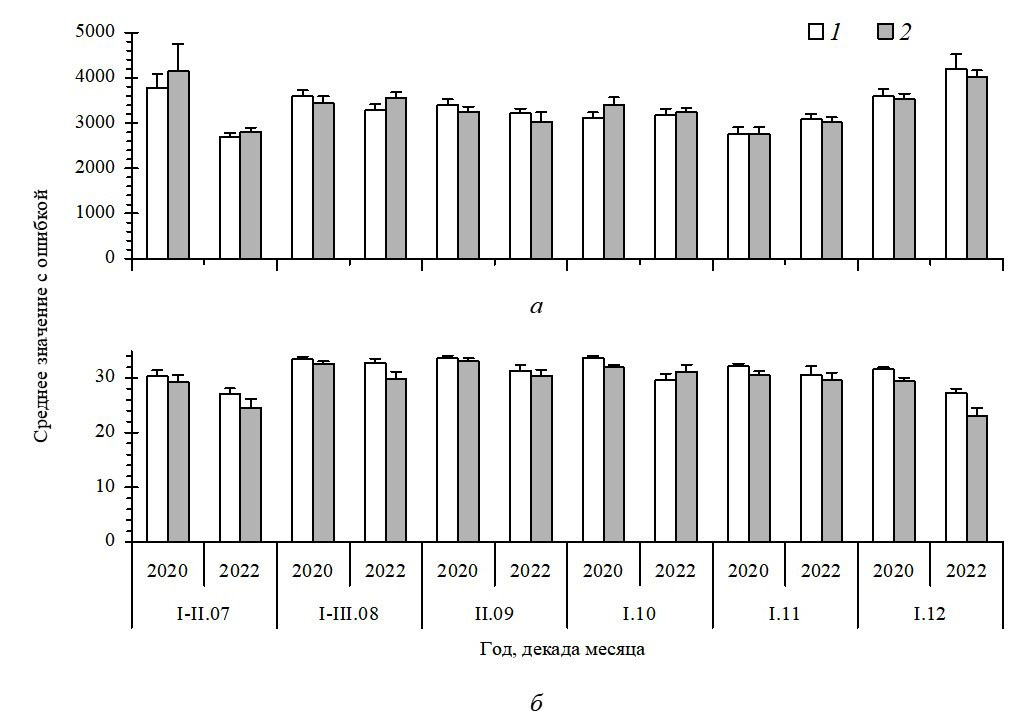 а – содержание аскорбиновой кислоты, мкг/г воздушно сухой массы; б – содержание водорастворимых белков, мг/г воздушно сухой массы. По горизонтали – год, декада месяца; по вертикали – среднее значение с ошибкой.