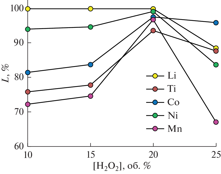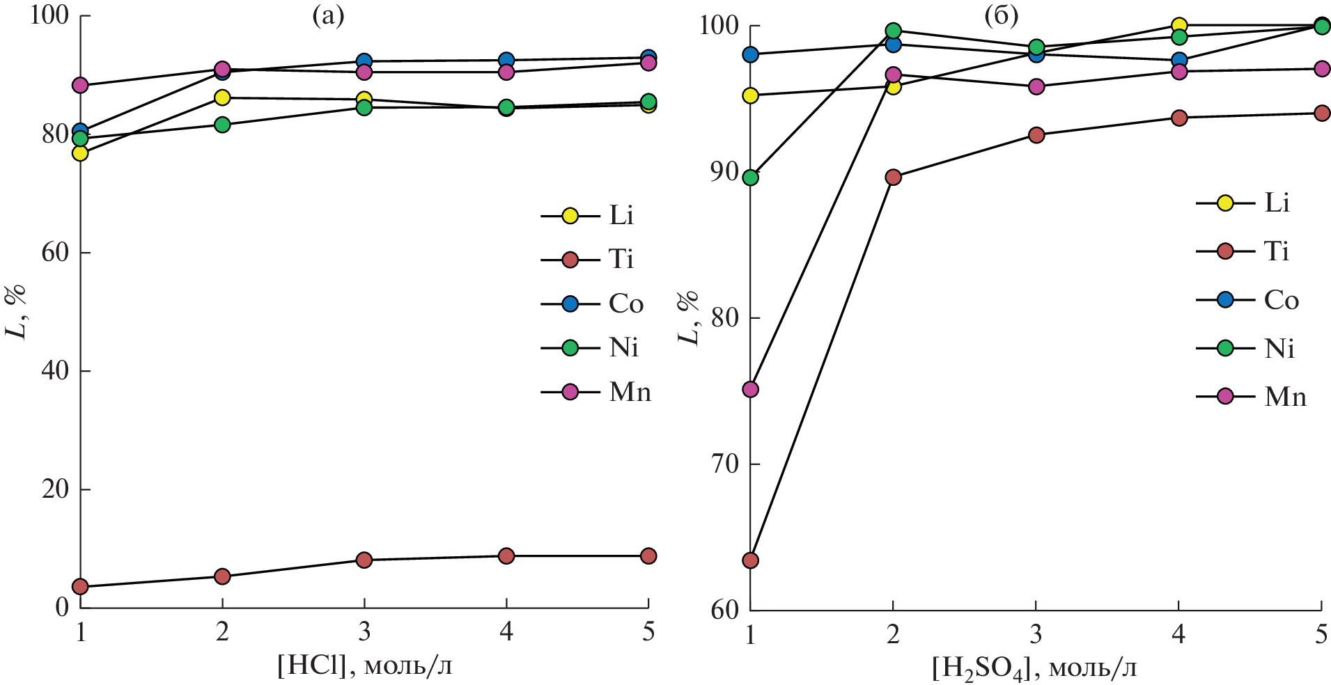 Lithium–titanate anodes are increasingly being used in the manufacturing of lithium-ion batteries due to their advantages in charge/discharge speed and safety of use relative to graphite anodes. The addition of titanium to the battery composition, along with the high content of cobalt and lithium, results in a further growth of their cost, and the reprocessing of such batteries becomes an extremely topical problem. In the framework of the present article, a comparative analysis of the hydrometallurgical reprocessing of batteries containing a lithium-titanate anode and a nickel–manganese–cobalt cathode by leaching with mineral acids (sulfuric and hydrochloric acids) is performed. In the work, the dependences of the leaching degree of the metals from real samples of the anode and cathode in their mixture on the mineral acid concentration, auxiliary additives, and solid : liquid ratio are demonstrated and the temperature and kinetic dependences for this process are obtained. Based on the results of qualitative and quantitative analysis of the leaching solutions, conditions for processing of the leaching process are proposed for further extractive separation. It is demonstrated that two-step successive leaching with hydrochloric and then sulfuric acid with the release of titanium concentrate is optimal. An important aspect of the work is the study of the joint leaching of the cathode and anode, since in the known processes of mechanical processing the stage of their separation is absent.