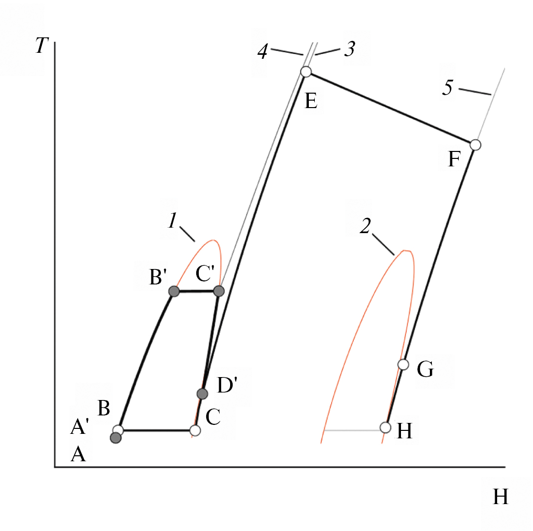 Рис. 6. Температурно-энтальпийная диаграмма процесса дегидрирования с интегрированным детандером. Линии: 1, 2 – линия насыщения реагентов; 2 – линия насыщения продуктов реакции дегидрирования; 3, 4 – изобара сырья при давлении реакционного процесса и повышенном давлении соответственно; 5 – изобара продуктов при давлении процесса.