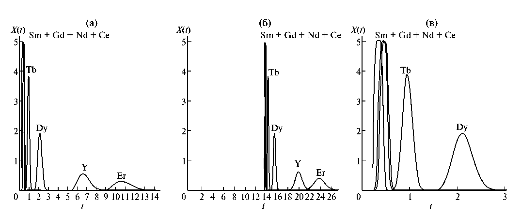Рис. 5. Результаты моделирования периодического процесса разделения РЗЭ в каскаде из 50 смесительно-отстойных экстракторов в режиме рециркуляционной хроматографии. Параметры процесса: tₛ = 0.3, S = 0.5, b = 1.5