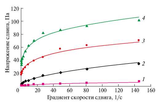 Рис. 2. Реологические кривые органо-неорганических гелей и их композиций: 1 и 2 – гелевые композиции песок-рисовая шелуха и песок-торф соответственно; 3 – гель на основе речного песка и рисовой шелухи, 4 – гель на основе песка и торфа.