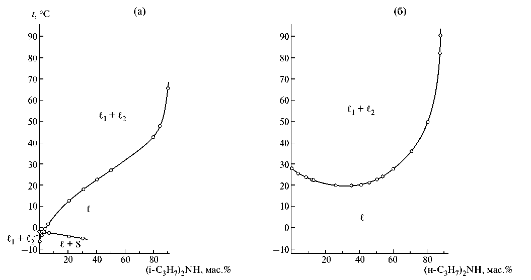 Растворимость компонентов в двойных системах вода–дипропиламин и вода–диизопропиламин исследовалась неоднократно и результаты исследований согласовываются удовлетворительно. Детальное исследование фазовых равновесий в смесях компонентов двойной системы вода–дипропиламин в интервале от –25 до 90°С проведено визуально-политермическим методом [33]. Установлено, что на фазовой диаграмме при –1.9°C поле кристаллизации льда соприкасается с полем расслоения, образуя трехфазное нонвариантное монотектическое равновесие двух жидких и одной твердой фаз. Растворимость компонентов с понижением температуры возрастает. Фазовая диаграмма этой двойной системы характеризуется областью расслоения с нижней критической температурой растворения (НКТР) при –4.7°С и содержании 27.2 мас. % дипропиламина в критическом растворе, который находится в метастабильной области. То есть расслоение и критические явления в таком растворе наблюдали только при переохлаждении смесей. В области высоких концентраций амина (около 90 мас. %) на линии солидуса обнаружен максимум при –15.6°C. Этот экстремум соответствует составу конгруэнтно плавящегося химического соединения дипропиламина и воды в молярном соотношении 2: 1 [2(н-C3H7)2NH·H2O]. При –20.4°C в смесях компонентов системы осуществляется трехфазное нонвариантное эвтектическое равновесие, твердыми фазами которого являются кристаллы льда и обнаруженного соединения 2(н-C3H7)2NH·H2O. В эвтектической смеси содержание дипропиламина составляет 80.4 мас. %.