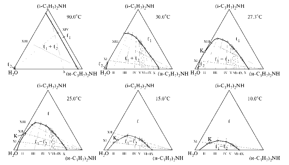 Политермические исследования. Политермическое изучение фазовых равновесий и растворимости в тройной системе вода – дипропиламин – диизопропиламин было проведено для смесей компонентов по четырнадцати сечениям трех типов треугольника состава. Смеси компонентов по сечениям I–X характеризовались переменным содержанием диизопропиламина и постоянным соотношением масс дипропиламина и воды: 5.00:95.00 (сечение I), 14.00:86.00 (сечение II), 30.00:70.00 (сечение III), 45.00:55.00 (сечение IV), 53.00:47.00 (сечение V), 56.00:44.00 (сечение VI), 58.00:42.00 (сечение VII), 60.70:39.30 (сечение VIII), 65.00:35.00 (сечение IX), 73.00:27.00 (сечение X). Смеси компонентов по сечениям XI–XIII характеризовались переменным содержанием дипропиламина и постоянным соотношением масс диизопропиламина и воды: 14.00:86.00 (сечение XI), 29.00:71.00 (сечение XII), 45.00:55.00 (сечение XIII). Смеси компонентов по сечению XIV характеризовались переменным содержанием воды и постоянным соотношением масс диизопропиламина и дипропиламина – 64.50:35.50.